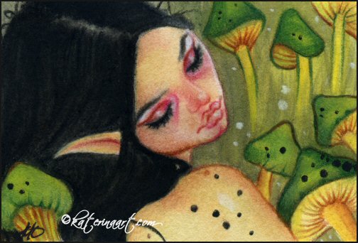 Aceo watercolor fantasy fairy surrounded by mushrooms portrait on watercolor paper ,2014.