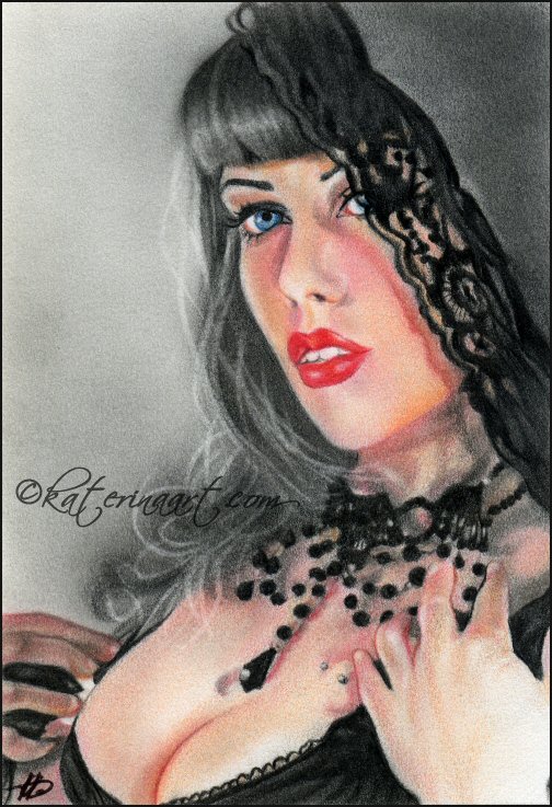 Completed for the Fantasy Art Auctions monthly theme "Vintage Pin Up" decided on a close up , of a vintage beauty with black lace and black pearls ,reference beautiful model Greek beauty Annie